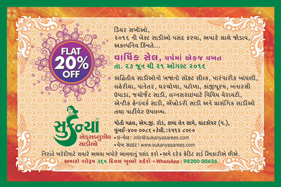 Mr. Mahendrabhai Gala ‘SUKANYA SAREES’ is recognized as the one of the most popular Saree Store in Mumbai for Unique Collection of Antique Hand Work Saree, Traditional Silk Sarees, Embroidery Saree, Laheria, Traditional Bandhani, Panetar, Gharchola, Kanchipuram, Banarasi Upada, Bridal Sarees,Georgette Sarees,Crepe Sarees, Party Sarees & Casual Designer Sarees. Our collection truly depicts the rich cultural heritage of India,